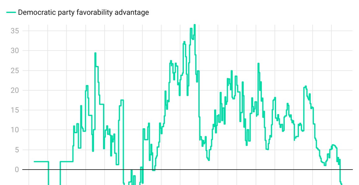 Currently, net favorability polling shows the Democrats down about ten points compared to the Republicans, as explained and shown here: