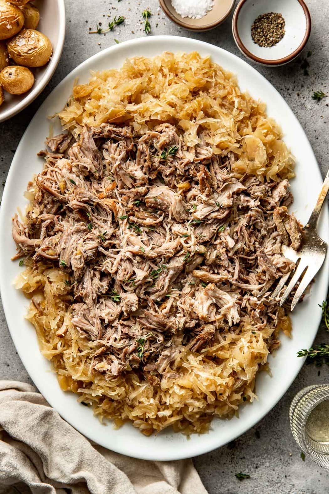 But you know what’s even better than combining already cooked pork with sauerkraut? Maybe not better, but different in a great way-- cooking a pork roast or shoulder with sauerkraut. There’s something magical that happens when you cook pork and sauerkraut together as a kind of stew. Old German recipe. My Grandma used to make this, and I loved it as a kid. Even my older kid, who was (is) a famously picky eater, loved when I made this.