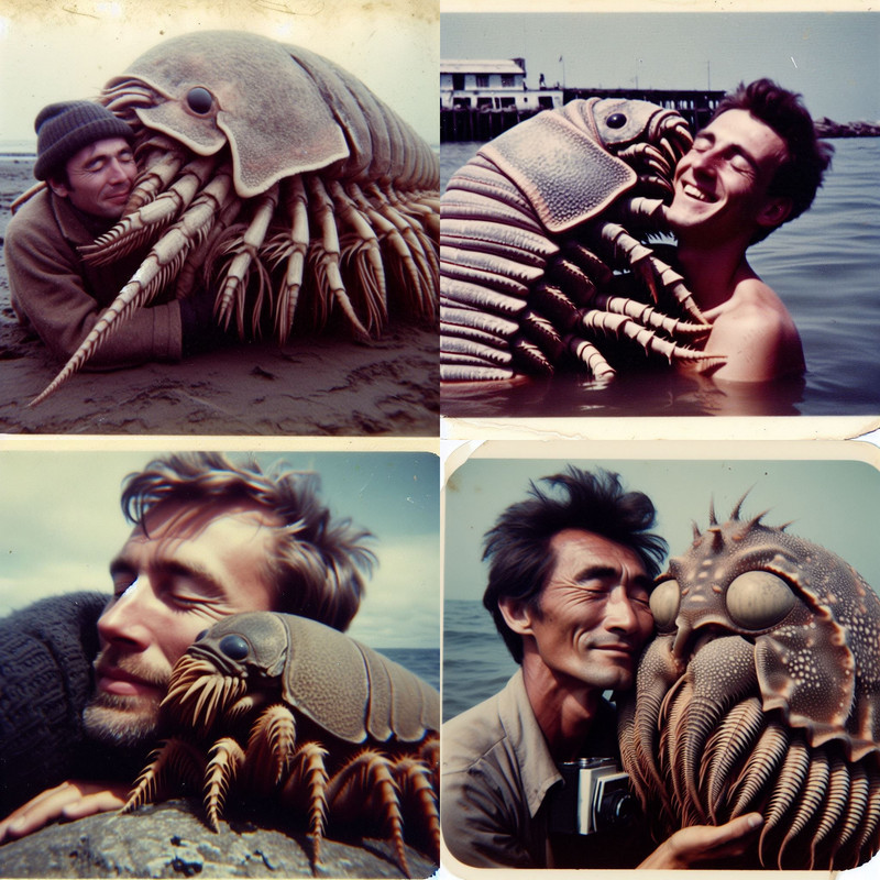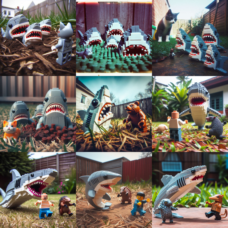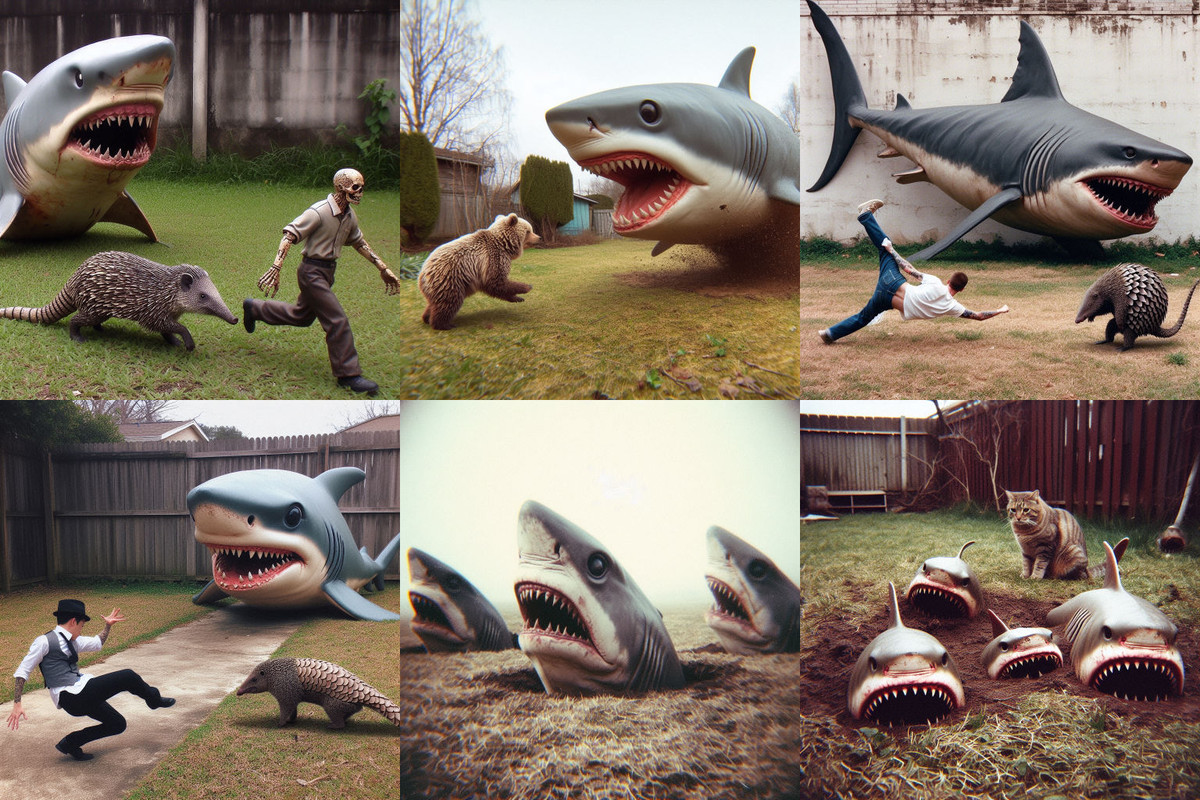 Today a Facebook friend posted a photo of his son lying on the grass pretending to be trying to escape a large shark statue that was in the yard for some reason. I tried recreating it with AI, then moved on to other creatures in a yard with a shark. It wasn’t until depressingly late in the game that it occurred to me that I was dealing with lawn sharks…