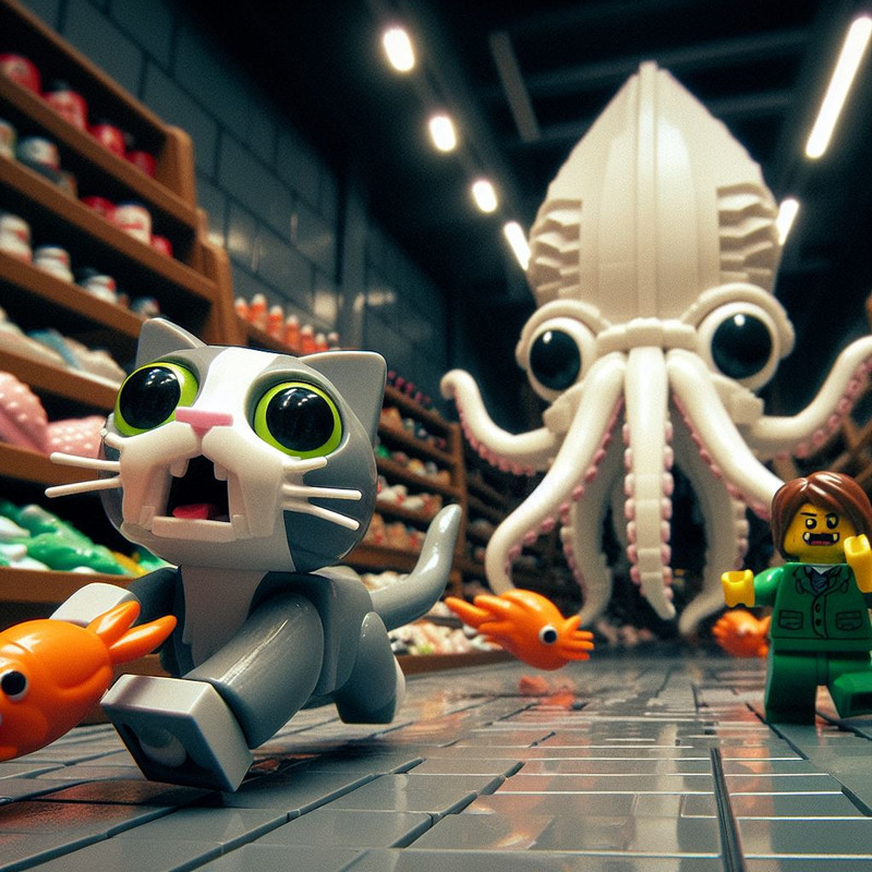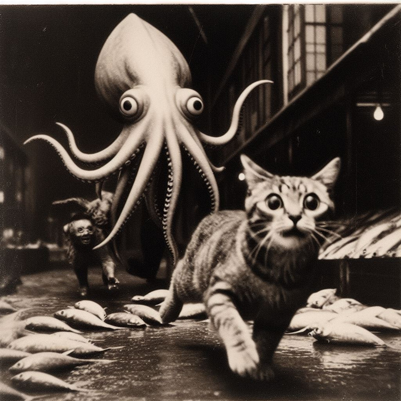 For me the most time-consuming part of generating AI images (with images that I don’t give further editing, at least) is choosing which images NOT to share out of a larger pool. These 30 images of a cat with a squid running from Cthulhu in a fish market are selected from 100 images that were generated.