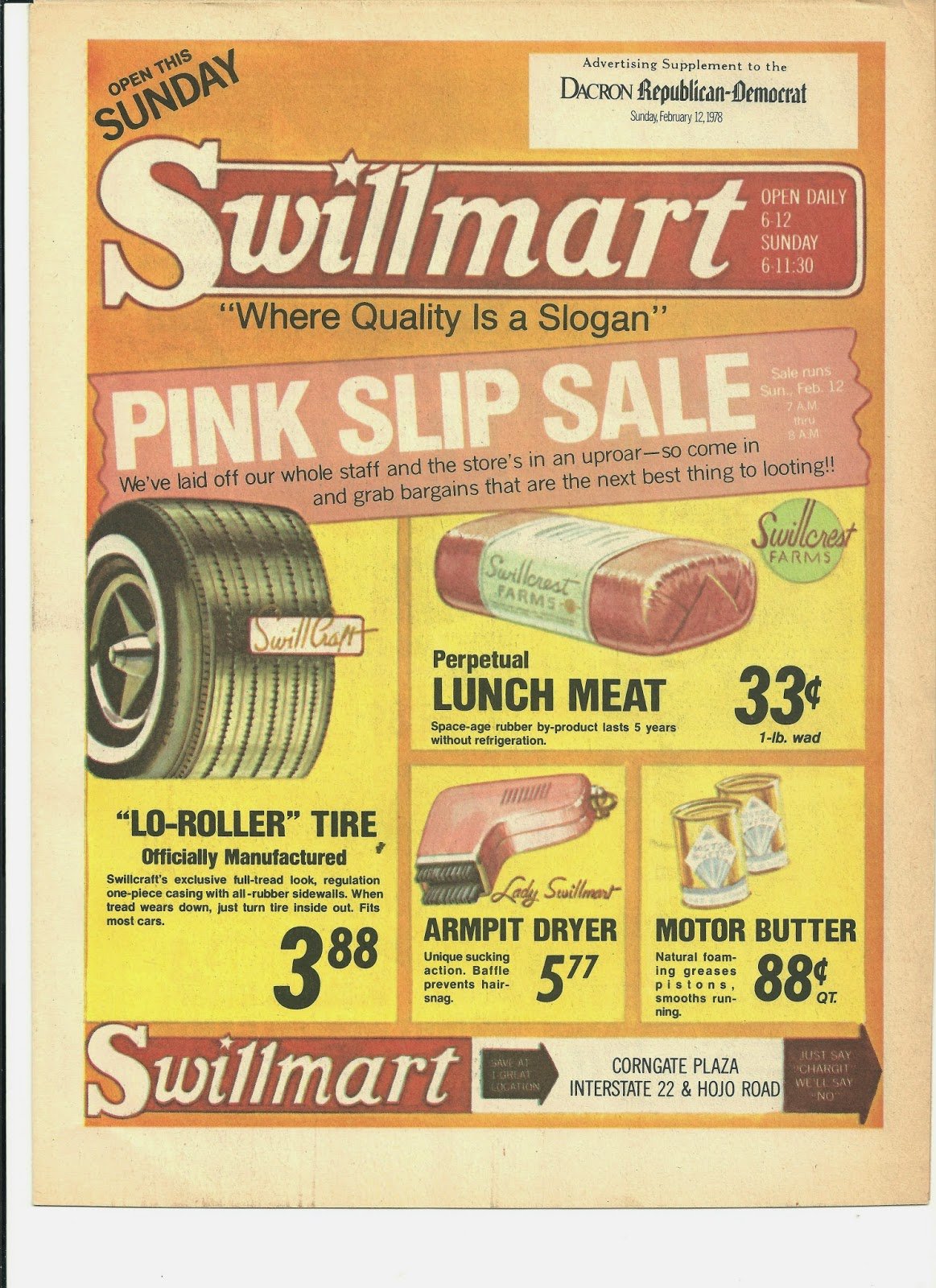 The ‘forgery’ was top-notch; it even had shopping inserts for stores like SWILLMART “Where Quality Is A Slogan”, illustrated by Bruce McCall.