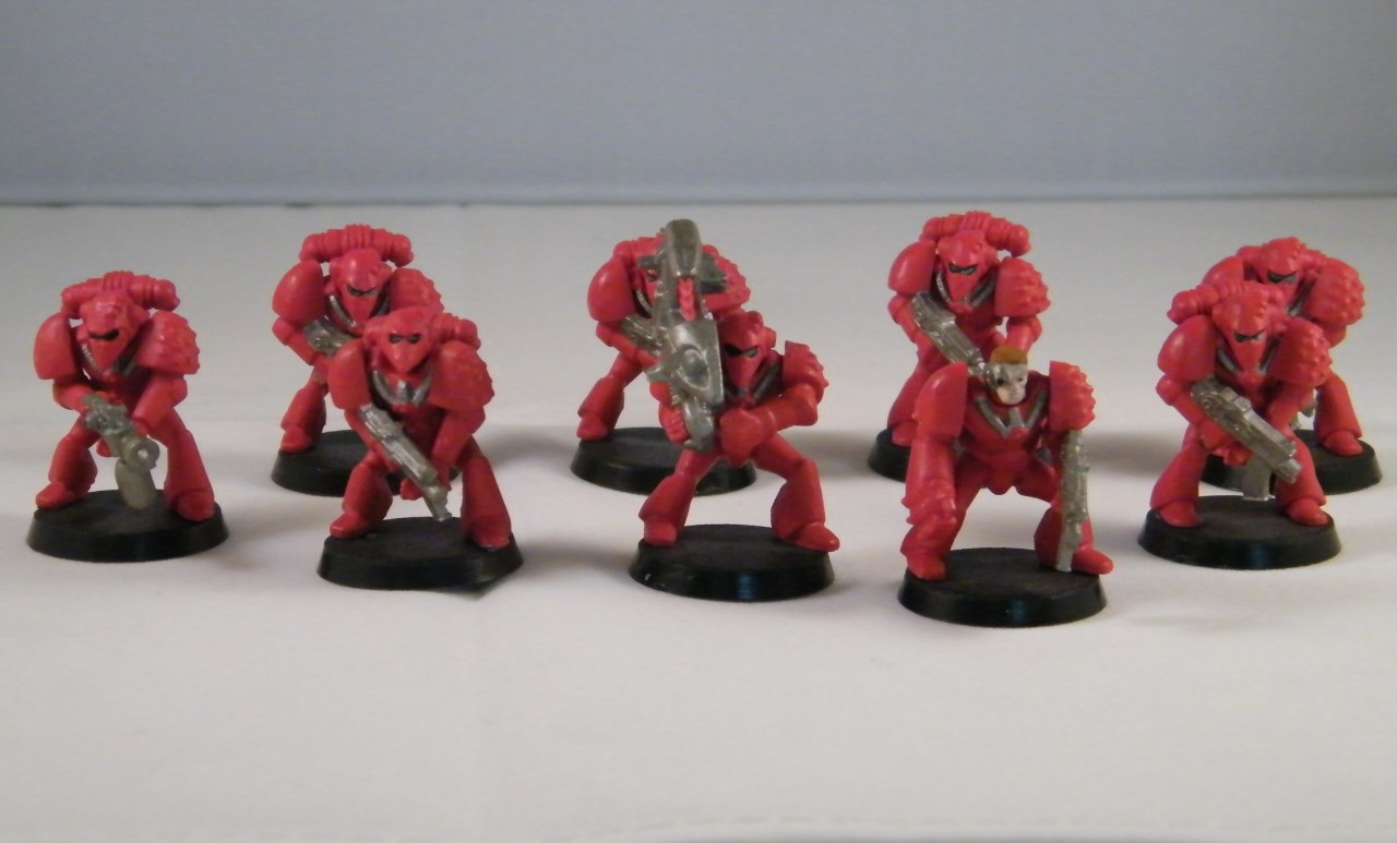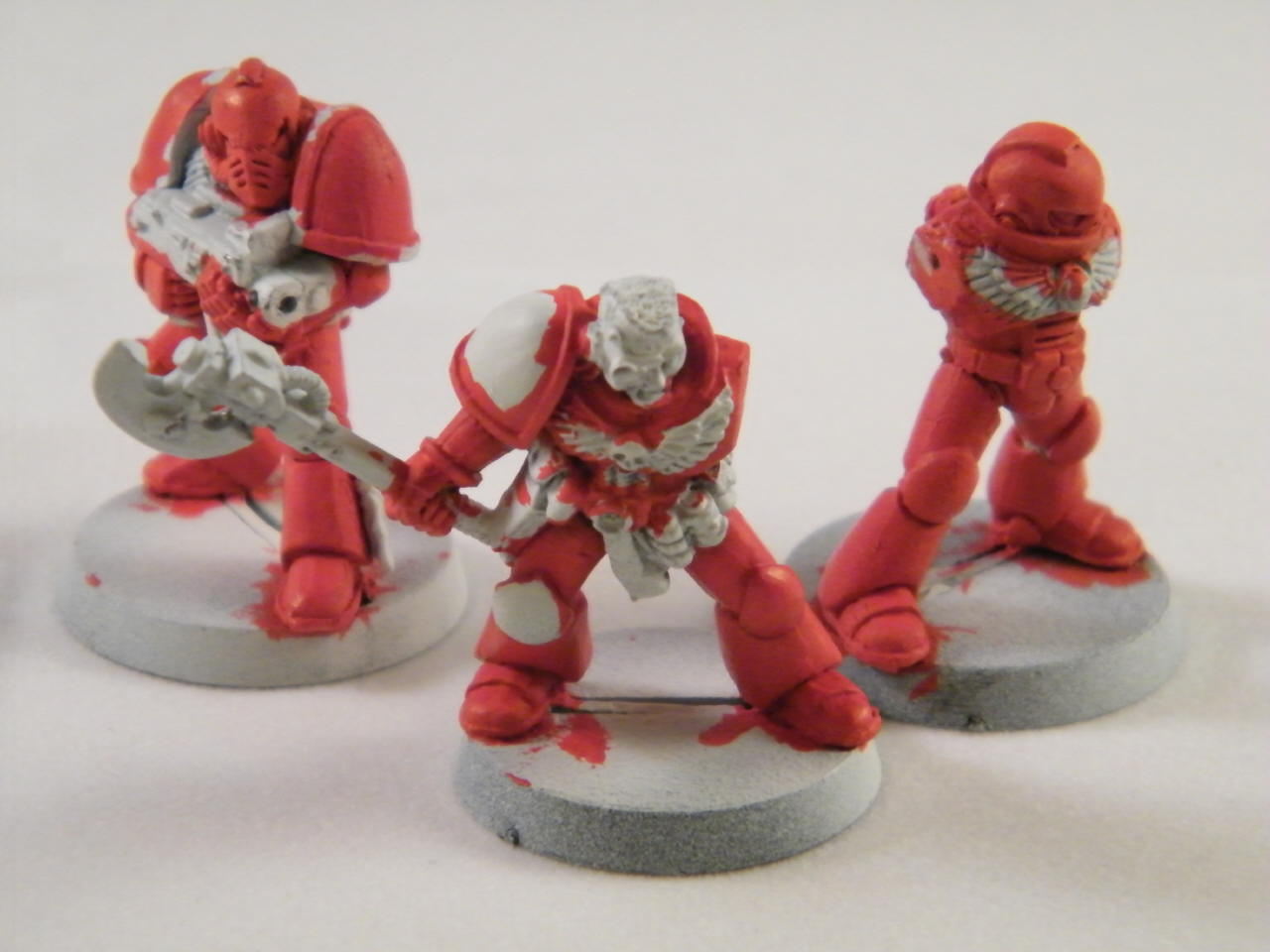 … and a trio of Blood Angels intended to flesh out the Third Company’s Fourth Squad (Tactical); from left to right, a Mk IV Imperium Maximus suit, a Second Edition Veteran Sergeant with bionic eye and power axe, and a Mk VIII Errant Armour.