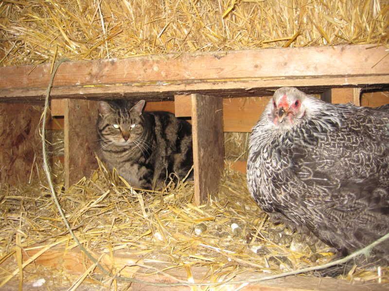 Goats are still preggers, chickens are still laying eggs, cats and dogs are doing what they do. I have one cat, Hey Jude! that plays with the chickens, he chases them, then they chase him. This is whereI found him yesterday. He sometimes sleeps with the damn hens!
