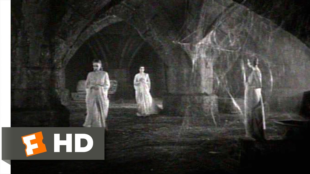 Interesting thing – in the original film, although we see coffins crack open and wavering hands emerge from them, and one of the “wives” sitting up in the coffin we never actually see any of the vampires getting out of the coffins. I suppose there’s some reason for it, but it’s not clear to me. Maybe they couldn’t do it gracefully. But the Spanish version shows Drac getting out of HIS coffin.
