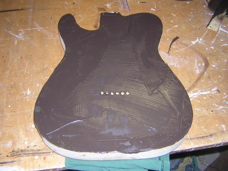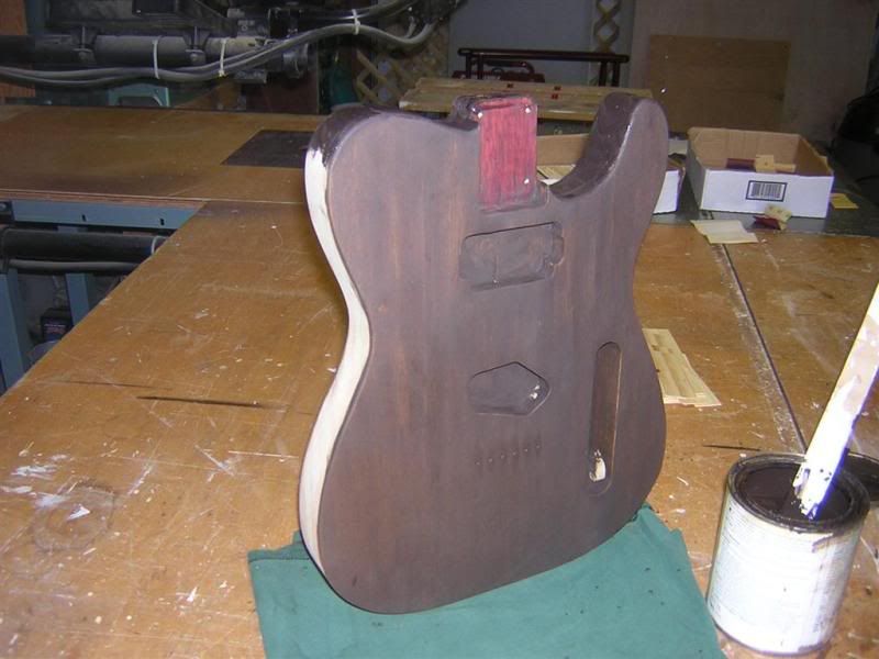 When I do it for real, we’ll probably need to fill 3x…the pores are really deep. The filler stains the light wood to closely resemble raw mahogany. The korina has a grayish cast that the luan does not, so we’ll see what adjustments have to be made.