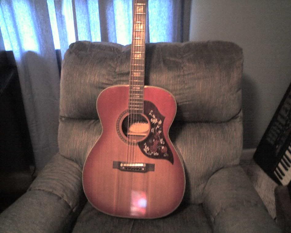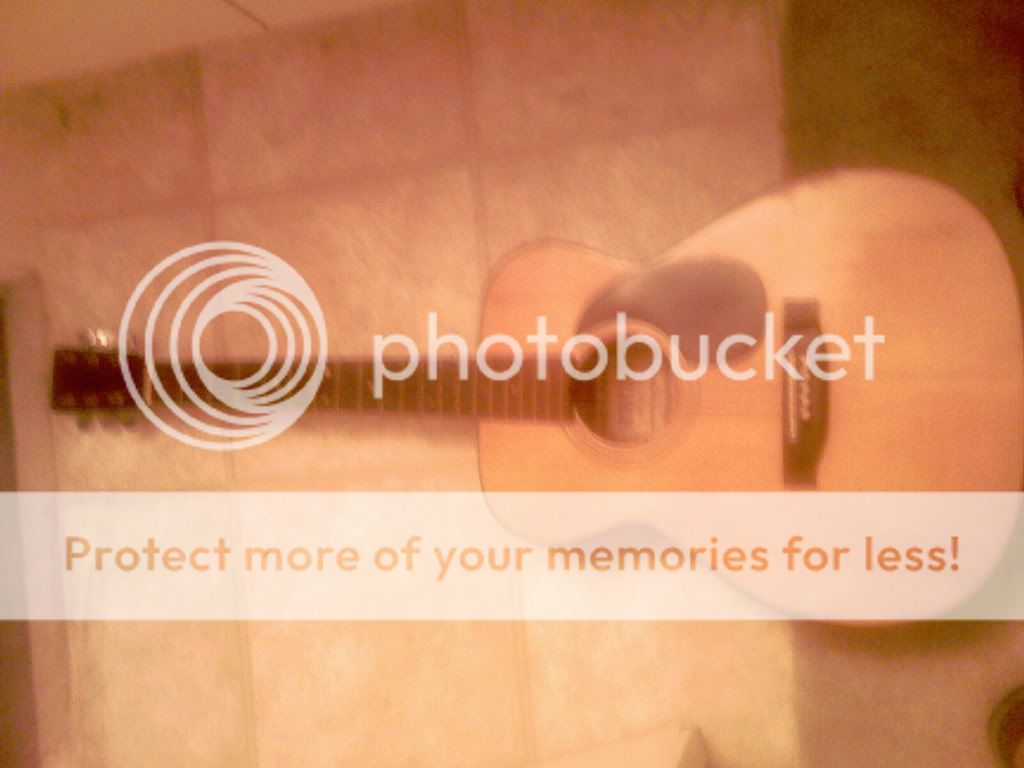 Guitar #6 : Alvarez acoustic-electric. This is the one that I have with me at (almost) all times. I was prepared to pony up for a much more expensive guitar, but of all the ones on the wall, this one just felt right when I played it. Also, its a jumbo, and since I sing extremely loud, it fits me perfectly. It is the only guitar I had to once get in a fistfight to hold on to, which proves that sometimes people just plain suck. However, it was once lost and then returned to me by some extremely nice folks, which proves that sometimes people are just plain awesome.