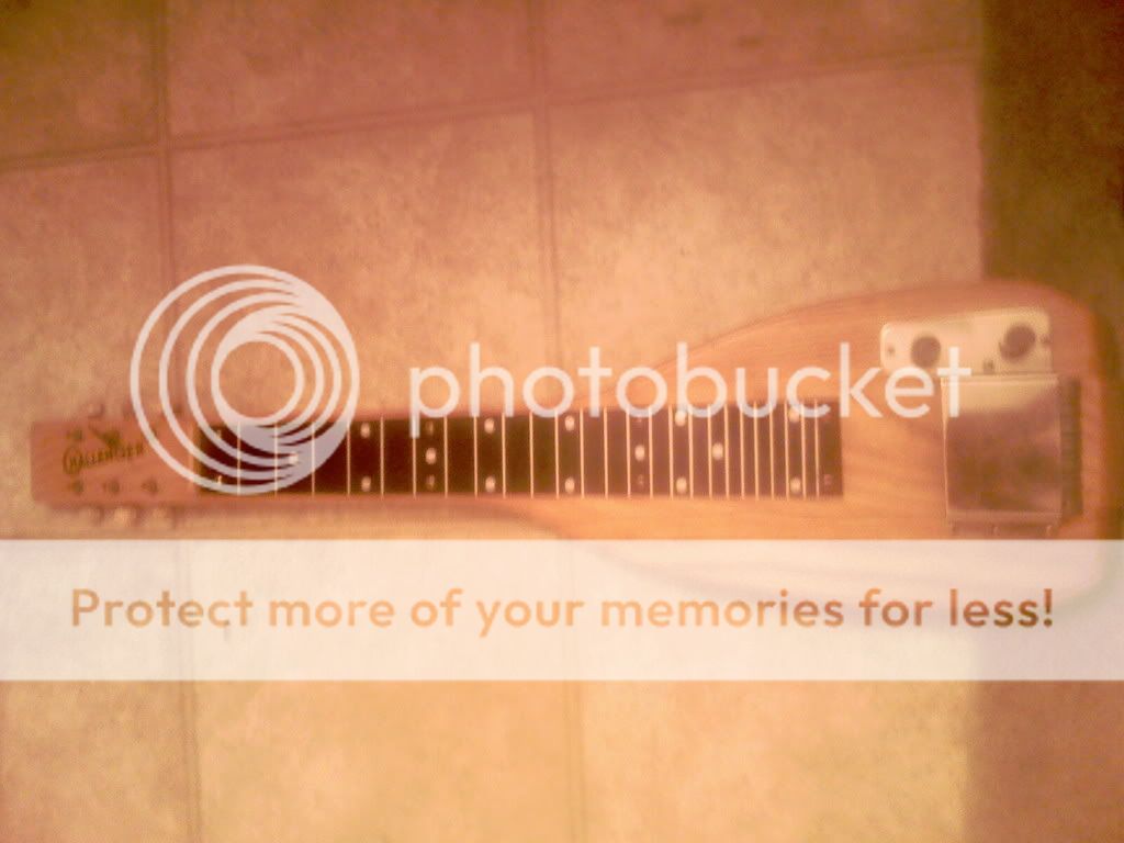 Guitar #2 : Lap steel. Has the name “Challenger” on it, but it looks oh-so-homemade in every way. I picked it up at a yard sale back in the day for $20. It had a great sound, until the pickup stopped working, largely due to the fact that I took it apart and reassembled it. Poorly. (Foolishness of youth X2)