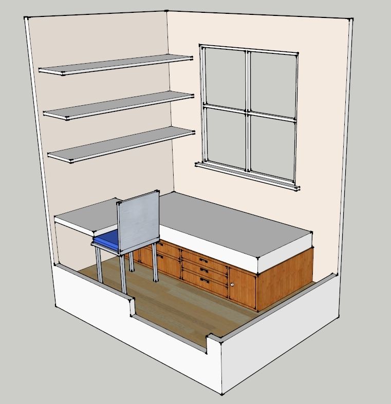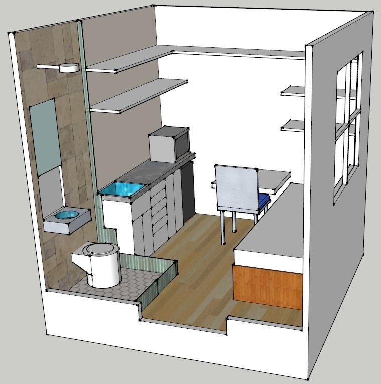 And here is a link to another sketch of an 8x8 space for one incorporating a minimal bathroom/shower (like units for small boats and the like) and kitchenette. Some walls cut-away so you can see most things. The sink in the bath stall is a fold-away, allowing a little more room for the shower (the toilet just gets rained on when you shower). The kitchenette has a small refrigerator/freezer unit, small microwave, sink, and some counterspace where you could have something like a hot plate, single burner, or George Foreman grill. I reconfigured the shelving over the fold-up desk so there is more room to maneuver by the “kitchen”, and there’s a bit more space at the foot of the bed.