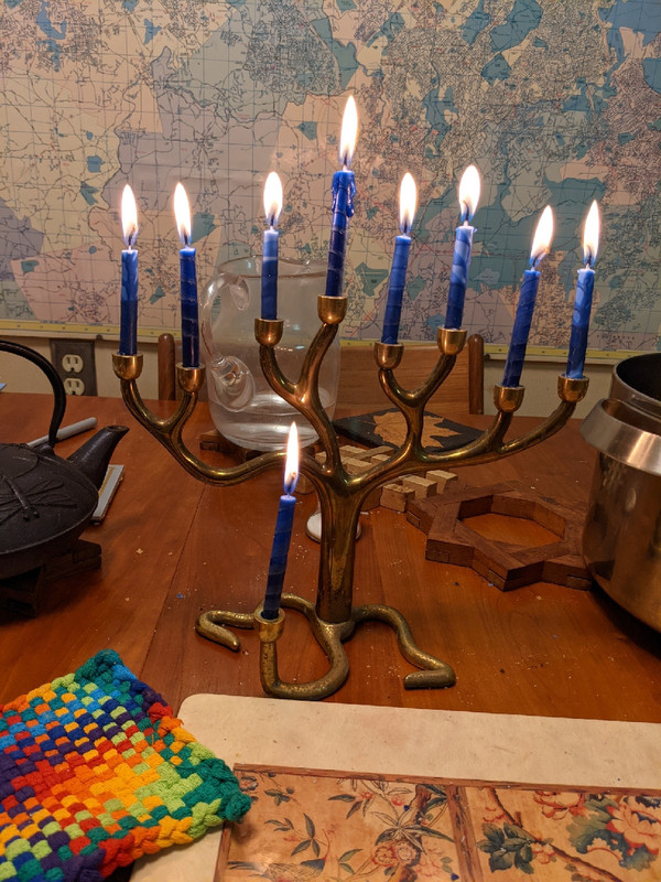 We had our youngest on the phone for lighting of the candles, since he’s with friends he hadn’t been able to see since Spring Break. I got to light the candles a couple of times, even though I’m a goy.