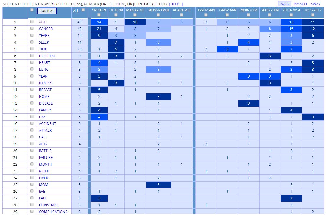 Also, with a corpus, you can sort out the newspapers from the magazines and speech, to see how many instances are in something like an obituary, where you kind of have to use the phrase pass away, as it’s part of the discursive formula for that kind of publication.