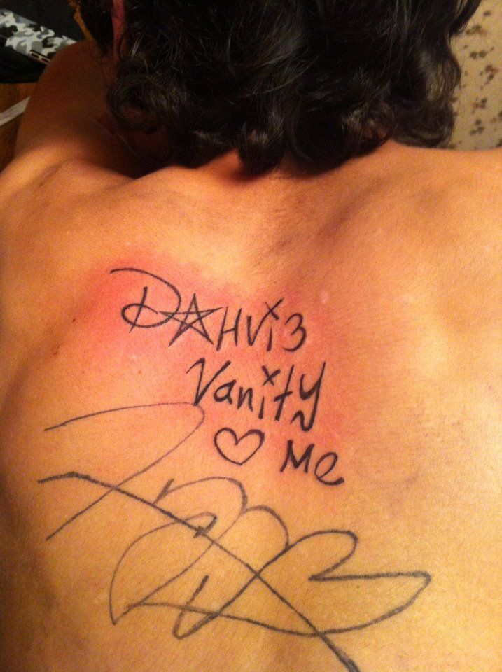 A couple weeks ago they discovered Blood on the Dance Floor would be playing in Cleveland. They asked their mother to take them to the show, which was four hours away. The mother happily obliged, and attend the concert with them. After the show, the 16 y.o. son asked Dahvie Vanity, the band’s lead singer, for an autograph on his back. The 16 y.o. son removed his shirt and Dahvie wrote “Dahvie Vanity Me” on his bare back with a felt-tip pen.