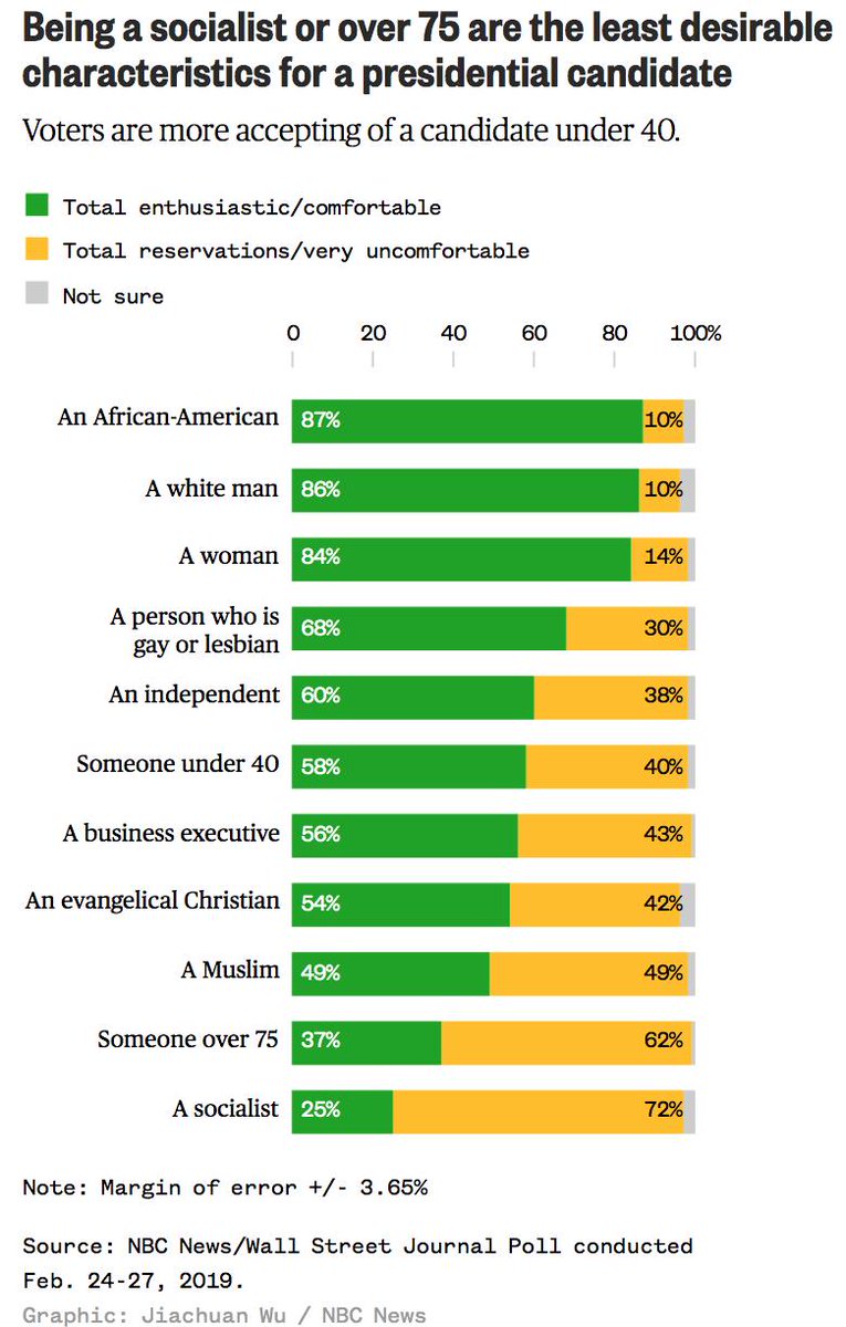 parts of the party but there are only so many of those and they will be split several ways. - My guess is both Sanders and Warren will last deep into the primaries, splitting the left vote to Biden’s advantage. In general I think there will be several candidates with