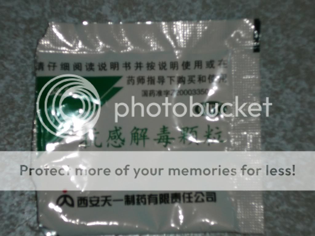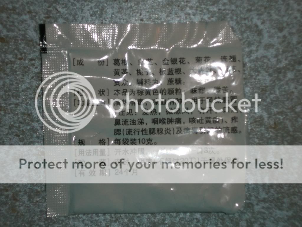 The herbal stuff is called Kangganjiedu granules. Scroll at the bottom of this page for some very basic info. That’s pretty much all that seems to be available in English. From what I can glean from the Chinese pages, it appears to be a popular remedy for relieving cold and flu symptoms. The instructions say to drink one pack, with water, 3 times a day.