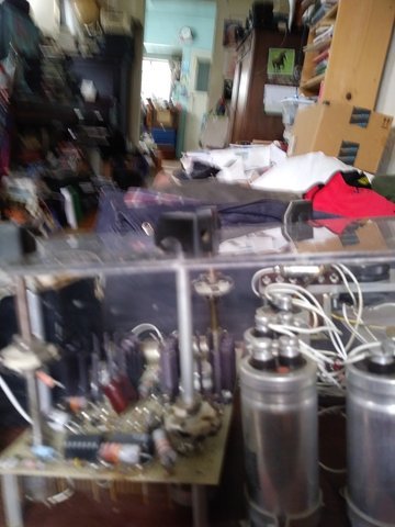 It has a car ignition coil, a transistor oscillator that produces a very powerful waveform made to produce a lot of current. It has 3 different controls attached to pots that appear to control harmonics. (We hooked it up to the oscilloscope. Wave forms are crazy looking.) These had knobs on them.