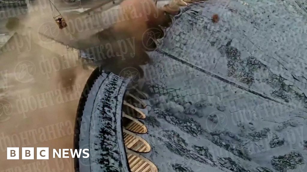 This spectacular view from a drone shows the fall of an old stadium being demolished in Russia. It shows what happens after many steel supports are cut and there are no other support beams to prevent a collapse.