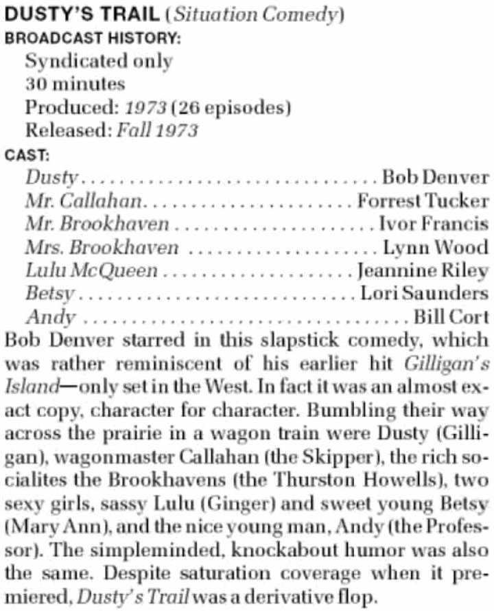 Good for Denver that almost everyone has forgot Dusty’s Trail. Almost everyone. As a kid, I couldn’t believe the show. “It’s just a near exact redo of Gilligan’s Island! Sonufabitch! Whatta rip!”