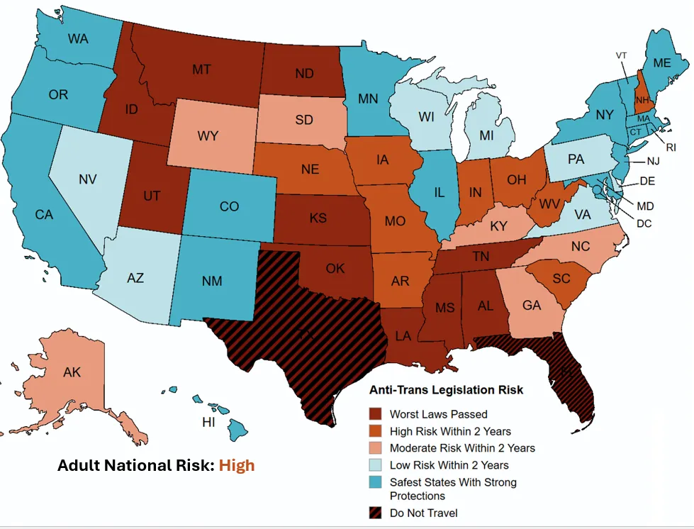 Wisconsin is still light blue, meaning there is low risk within the next 2 years of any anti-trans legislation being enacted. The adjacent states of Minnesota and Indiana both have actual protections in law, so might be places to plan to go to if necessary.