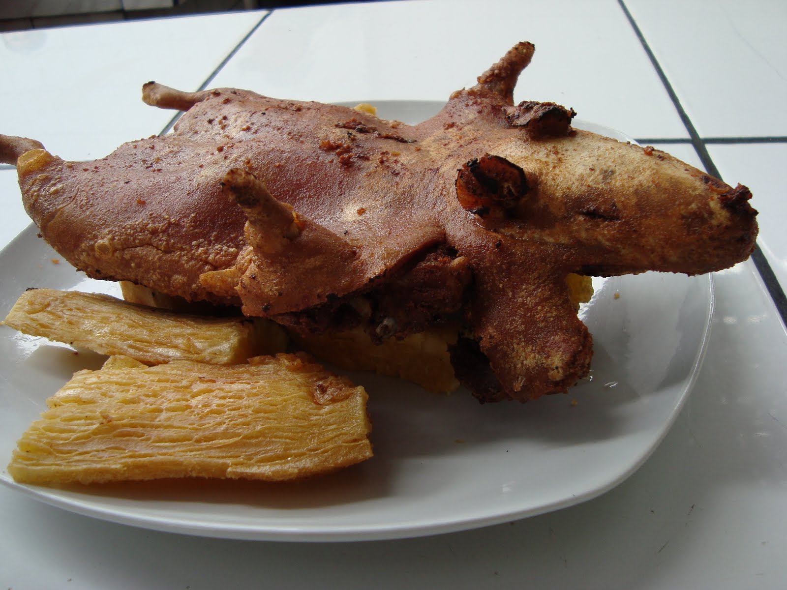 A friend of mine took a picture of a roasted guinea pig she was served in Peru. As part of the preparation, they took a big green pepper, cut the blunt end off and made a little clown hat for the cavy to wear. The pointy end was shoved up the poor creature’s butt. They don’t just kill and cook it, they humiliate it as well.