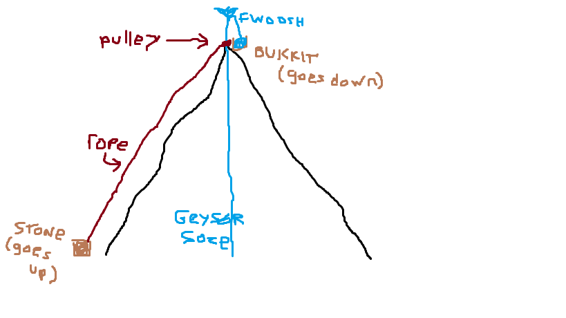 If they were going to do something like that, an even easier method (not requiring magic geysers) would be to fill the bukkit by just carrying water up there in a bukkit brigade. Or using sand, which is heavier, not in short supply, and evaporates more slowly.