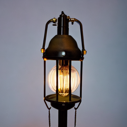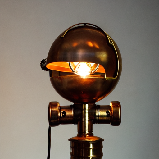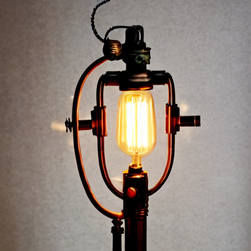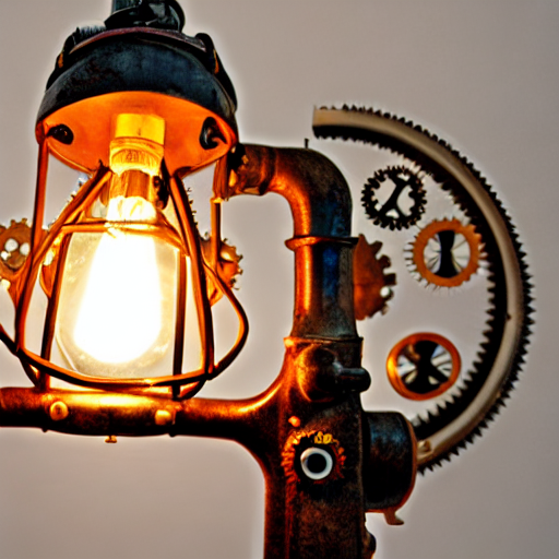For fun, I typed “a photograph of a steampunk lamp” into the online diffusion AI art generator to see what the computer thinks that is, and mostly they just look like incandescent lights, but the first image did indeed suffer from a bunch of random gears in the background: