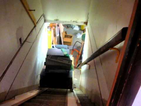 Essentially, a simpler version of this. No tracks or wheels, just mounted it on some wood and let it slide up and down the stairs.