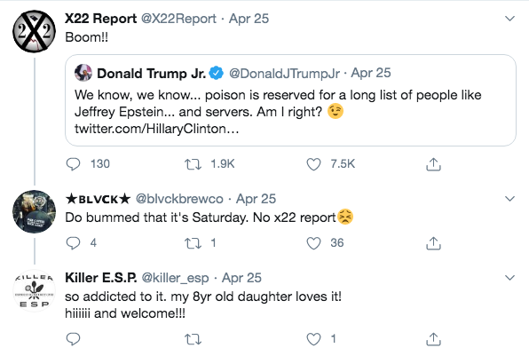The tweets show QAnon support, anti-covid conspiracy, comments about Hillary Clinton eating chlidren, and telling black people to improve their own lives instead of “waiting decades and decades for a President to do it.”
