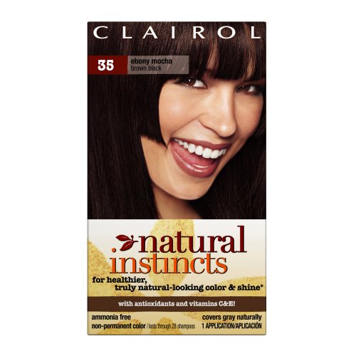 I’m a big fan of Clairol’s Natural Instincts in 31 (Coffee Creme) or 35 (Ebony Mocha) (they’re pretty much the same color, at least on my hair). They’re semi-permanent, but in my experience the color doesn’t fade in the six weeks or so between colorings. (I have to dye that often to color my gray patches.)