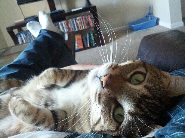 The name given to him at the shelter is Marcel, but Da Rugrat is considering other names. He’s holding out for ‘Bus’ at the moment, because at 14 lbs, the cat is as big as one. FDil likes ‘Calcifer’, a demon character in one of the video games they play.