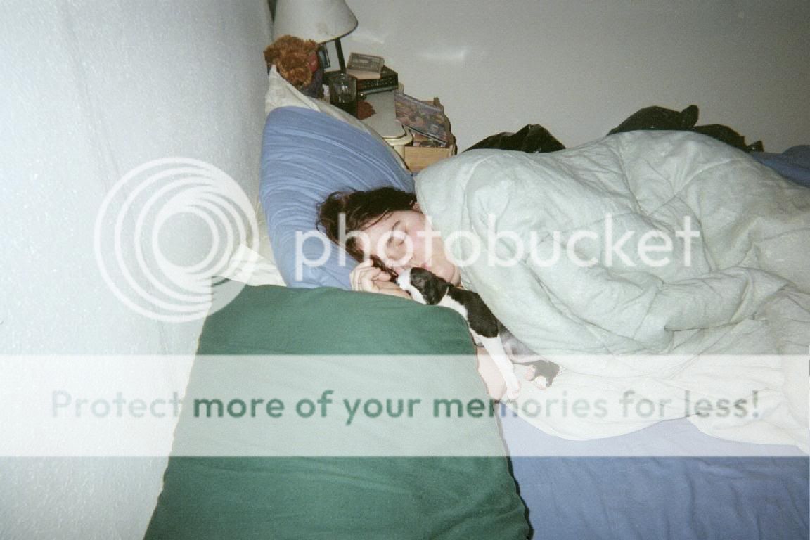 I go to sleep with a Boston under each armpit, with their little chins nestled on my biceps. Much snoring ensues. (I’m assuming your baby girls snores like a fat old man – all Bostons sound like that.) When they get hot, the male will get up and lay down by my feet. The female will not move. She just pants, smashed up against me under the covers, refusing to move but too hot to sleep.