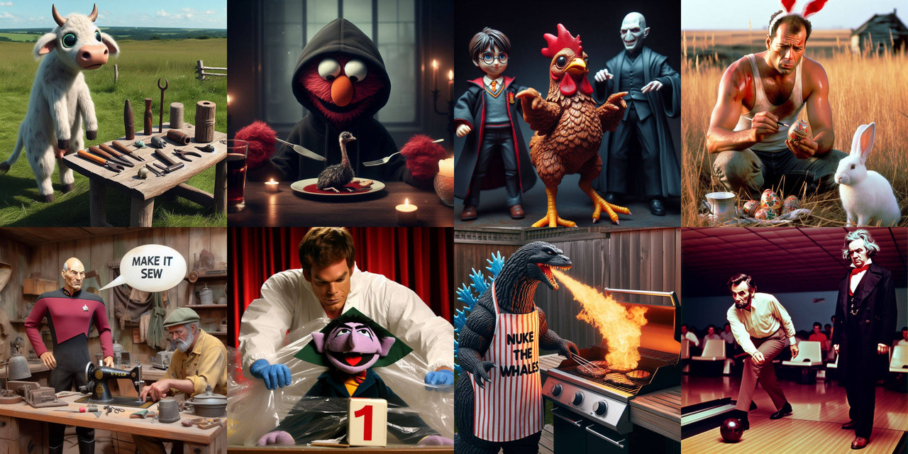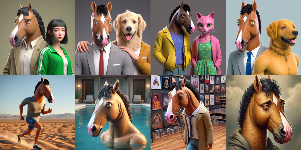 And it can take those concepts and put them into different poses, situations, and media from any likely images in the training set. For example these reasonably accurate Bojack Horseman images that aren’t the simple drawing style of the cartoon. (He was the only character Bing recognized by name, other characters had to made from descriptions.)