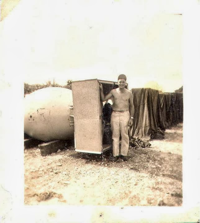 Is it possible that an atomic bomb would have had what looks like no security while it was waiting to be dropped? It’s hard to believe that something like that would just be resting out in the open somewhere, and that a couple low-ranking guys could manage to have time alone with it. Then again, what the hell else would it be? The fact that he was stationed on Tinian is beyond dispute. What’s more, wikipedia sez that three bomb assemblies were transported to the island and that sure looks like two more of the same under those tarps in the picture.