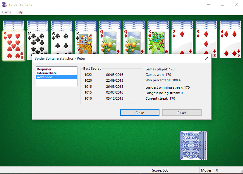 My high score is just 1116. I make a lot of unneccesary moves just to consider the choices, and a lot of rearranging to consolidate suits. Maybe one day I’ll try to play for score, but I enjoy just trying to win. I don’t use Undo because if I start then I’ll end up trying every possible path through a game and each one will take hours or days.