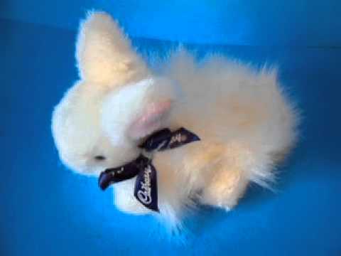 We had a black, Cadbury bunny plushie, from about 2006, that clucked like a chicken. Very small and bunnylike. We let our cats play with it, and dragged it out annually for my kid’s easter basket. I don’t know where it is now. But I found a video of a similar model: