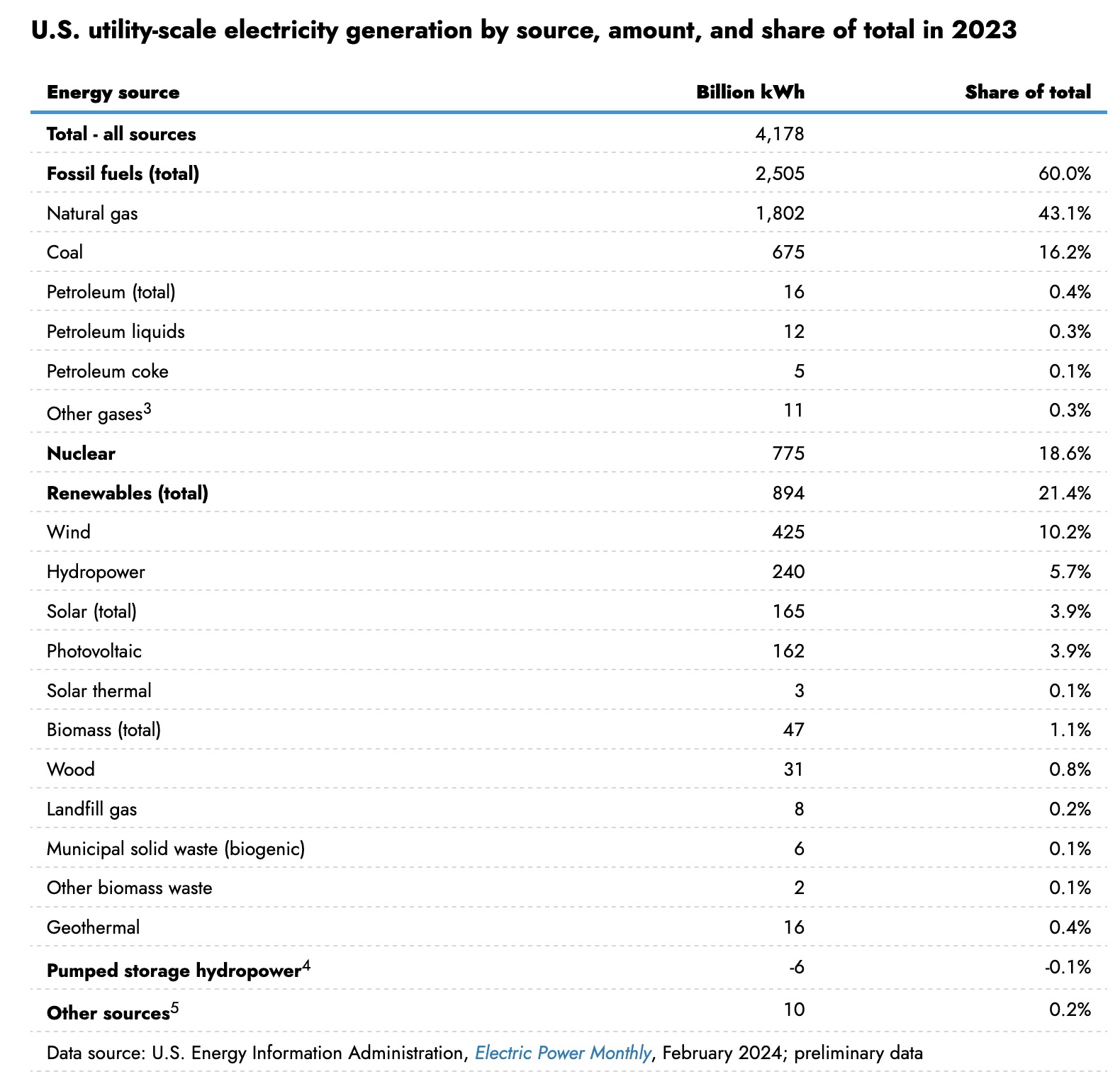 Speaking at the “macro” level, as a nation, US electricity production is largely via fossil fuels… 60% of our electricity comes from natural gas and coal:
