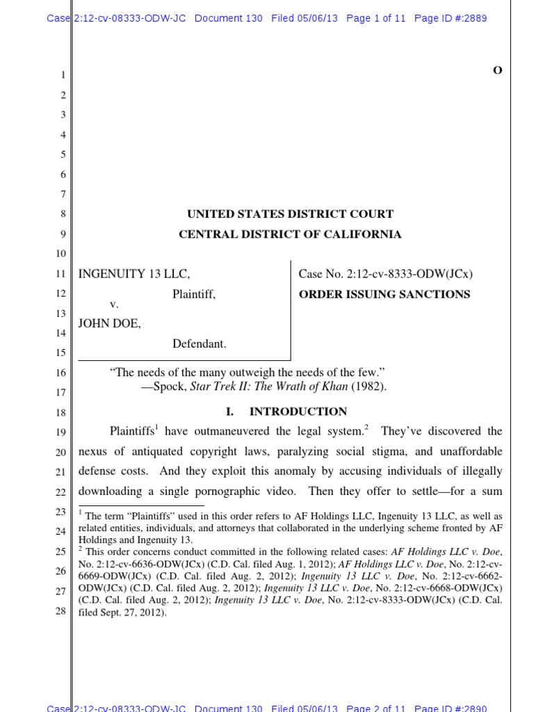 I checked. It indeed was Prenda. Ingenuity 13 LLC v. Doe, No. 2:12-cv-08333-ODW-JC (C.D. Cal. May 6, 2013)