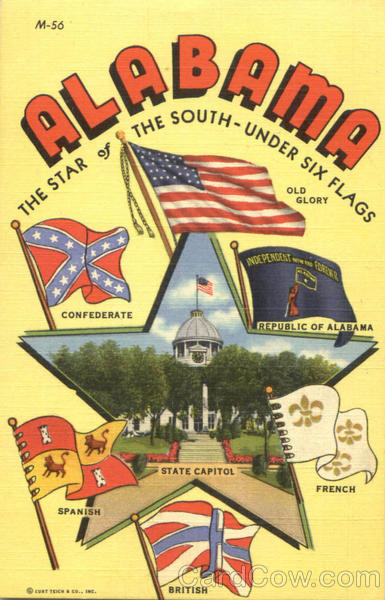 Seeing a pattern here? Travelers were sending back postcards with Confederate flags on them, to signify that they had been to Dixie. (As in Dixie Crystals. As in Dixie Oil. As in Dixie Cola.)