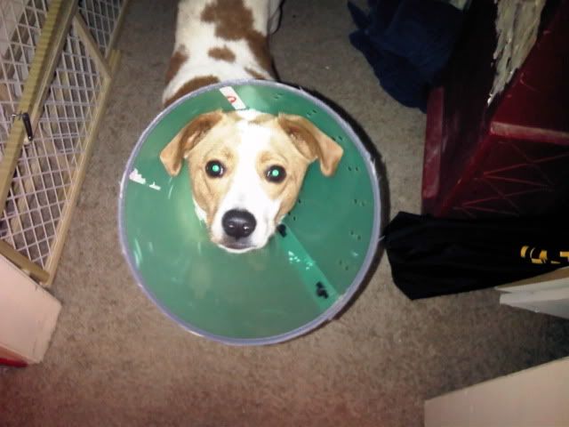 Doggio - I must have missed something important from last week. Why does Gordie have a cone and is it stuck up his arse?