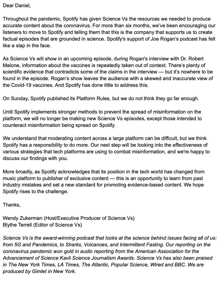 The letter below isn’t too long, but the TL;DR is (paraphrasing) “Spotify supported us for six months producing strong science content and telling our listeners to switch, and then they slap us in the face by supporting this other shit.”