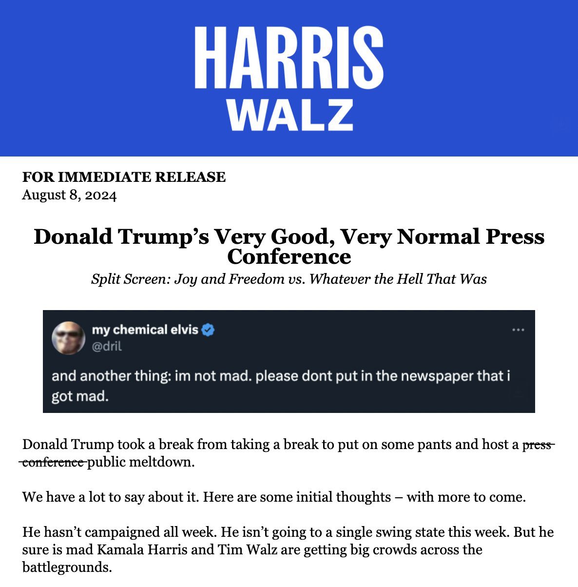 NBC News is stating this was a Harris campaign press release re: Trump’s press conference today. If so*, fast and funny. **I can’t find the original source - can anyone confirm it?.
