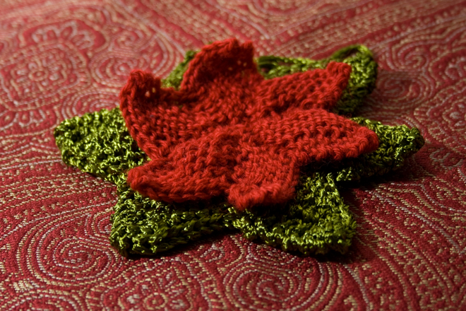 I kind of guilt tripped myself into knitting some poinsettias. I found this pattern and knit up a shiny green star which immediately said “hey, I look like poinsettia leaves, idiot, not a star. Use the red yarn!” so I’m making a smaller star in red to go in the middle. Then I’ll do it all over again so that I have a matching set to go out to two different recipients.