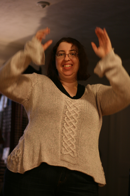 I just finished making up a weird-ass variation on a very simple pattern. The pattern is called Basil, from the Rowan Summer Tweed collection. I modified it to have a lot of weird cably things going on.
