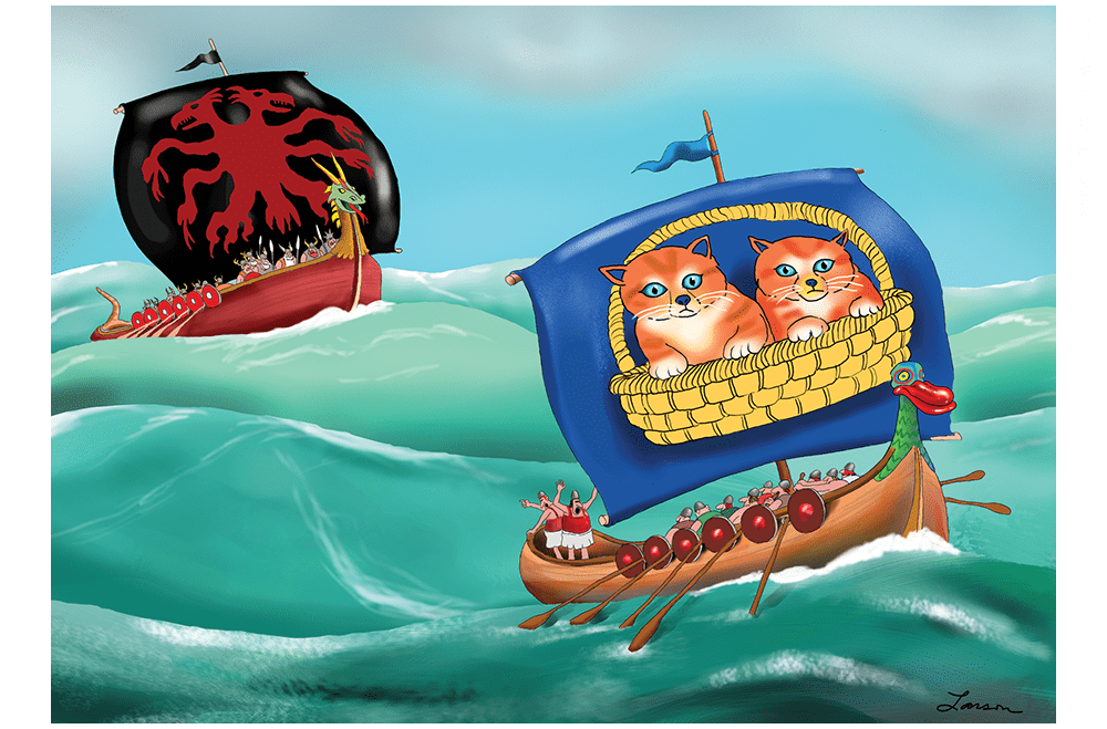 I think it’s just that some Vikings are evil, as represented by a seven headed dragon, and some are nice, as represented by a basket of kittens.