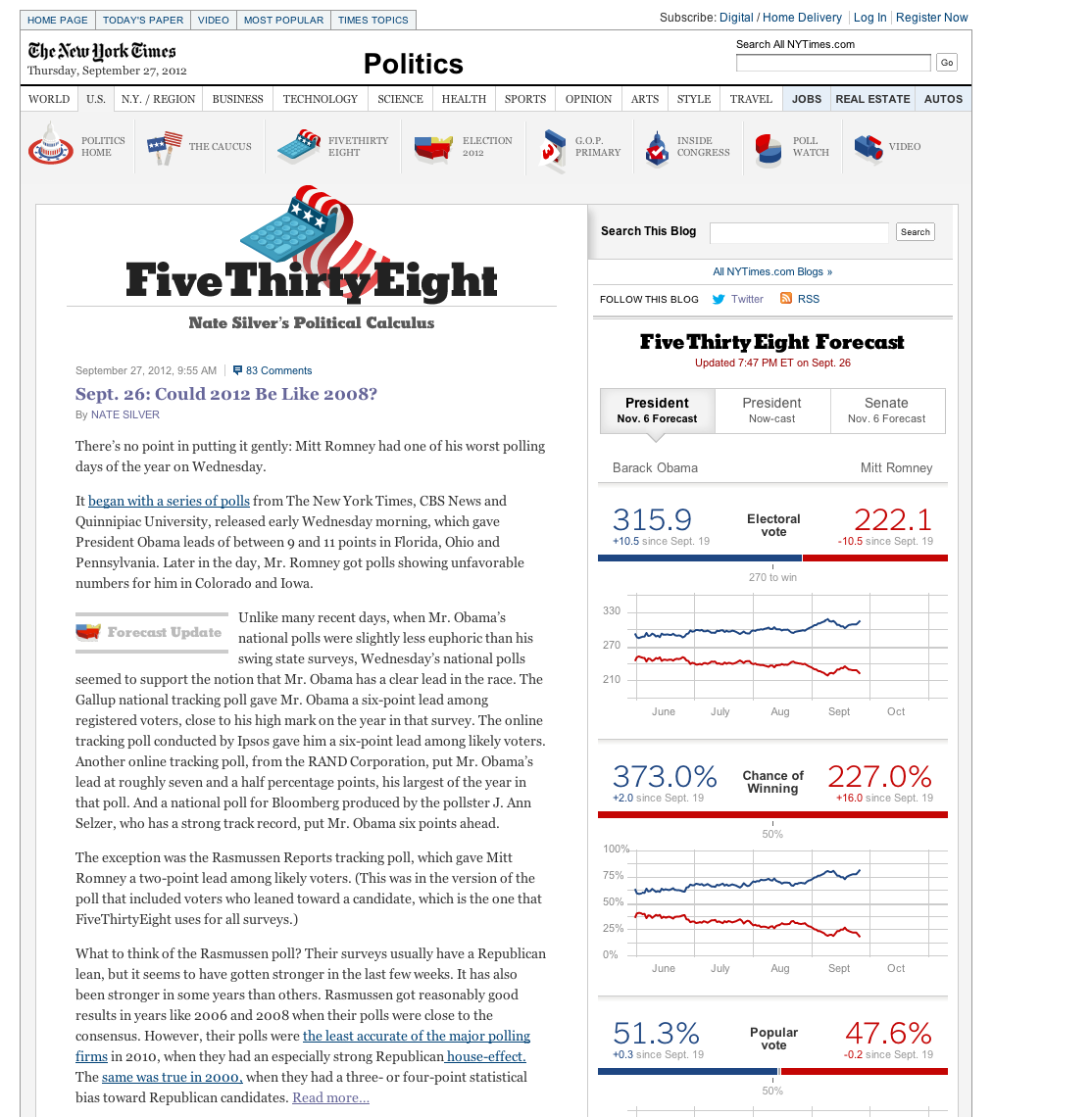 Huh. The current 538 site, at least on my browser, shows Obama with a 373.0% chance of winning. However, Romney has a 227.0% chance of winning, too. This is what I see. It’s a liberal conspiracy!
