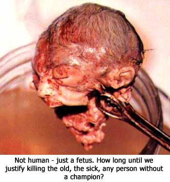I won’t contest your photos. Abortion can be - probably often is - very gruesome, even horrific. I don’t think pro-choicers should gloss over that. But, to paraphrase LeeshaJoy, so what? The same is true of surgical procedures, slaughterhouses, slums, and battlefields. The difference is that people who want to eliminate those things don’t try to pass laws against surgery, meat-eating, being poor or going to war. They work to eliminate the need for those things. Just like people who support the right to abortion usually also support greater access to birth control and sexual education to reduce unplanned pregnancies.
