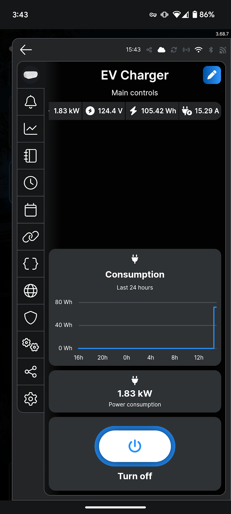 Turns out the EV, even when set to 8A charging, is actually drawing 15.5A at the outlet, according to that meter. If I set the EV to 16A or “MAX”, it draws so much current that the power meter shuts itself down (overcurrent protection after 16A)