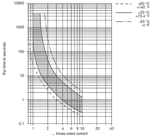 Most people think that circuit breakers exhibit a “step function”- under 15A, and the breaker passes the current, over 15A and the breaker trips instantly. This is far from the case, and wouldn’t be desirable. A common 200W incandescent lamp might pull over 20A the moment it is turned on, and the would cause nuisance tripping of such a circuit breaker. Breakers have trip curves that look something like this.