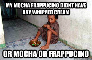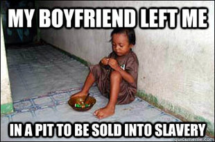 And, it’s not a call to think about starving Ethernopians, it’s a call to get a grip; some issues are so small in the grand scheme of things that complaining about them publically in order to garner sympathy is just dumb. Learn to not cry wolf every time a privledge you have access to doesn’t work quite as you’d like it to.