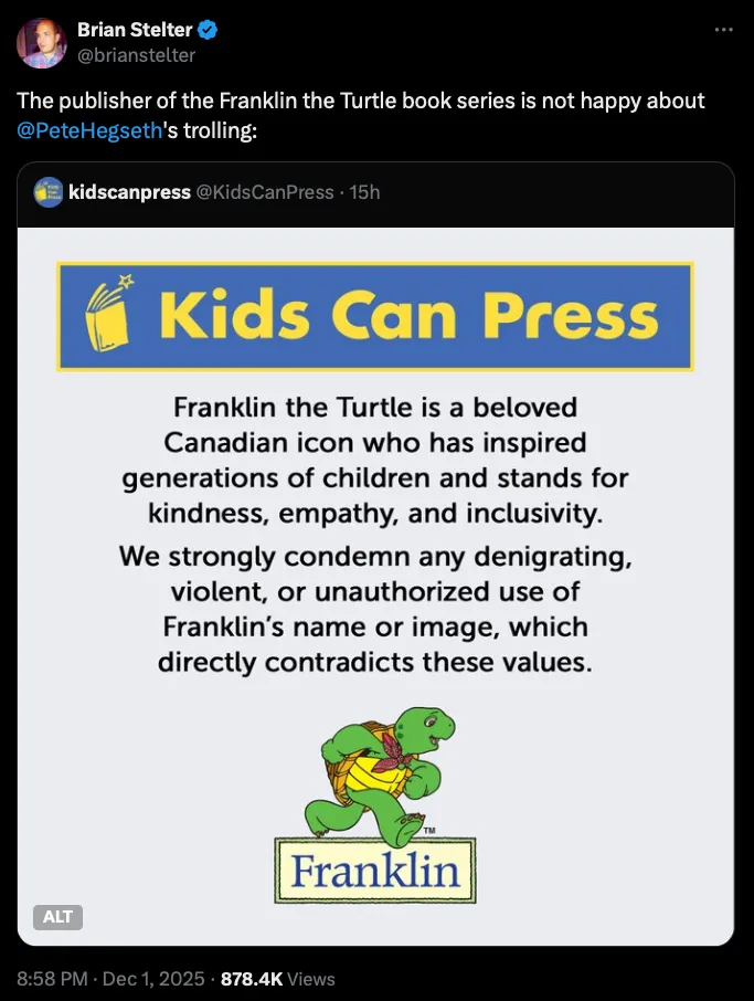 The fact that it’s mostly known (at least in western society) for its alt-right imagery is horrible. And it’s why the publisher of Franklin the Turtle is completely serious about pushing back against the shit that Hegseth is popularizing.