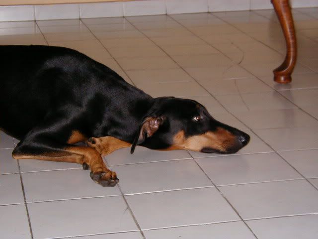 Funny thing is, when I take her out on walks, ears flapping, tail wiggling like mad, most people still realize she’s a Doberman and will go to such extremes as walking across the street from us. Goes without saying said behavior gives me more than a chuckle.