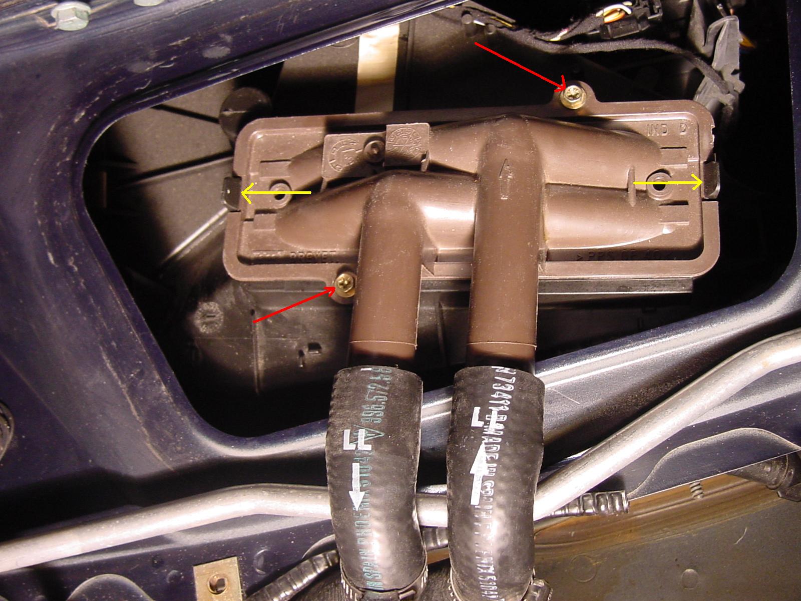 The brown colored plastic you see there is the top of the core. Held in by two screws, and two clips. Clamp off those two hoses, loosen clamps, remove hoses. Pull core out. Reverse steps to install new core. Do it right, and you hardly even have to burp the system. An hour max.